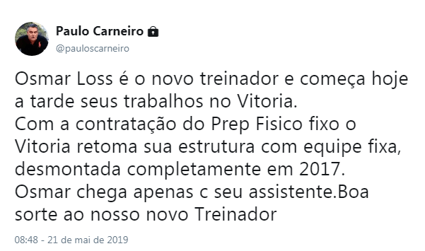 O presidente do Vitória, Paulo Carneiro, anunciou nesta terça-feira (21), em sua conta no Twitter, a contratação de Osmar Loss para o comando técnico do Rubro-Negro. O treinador chega em substituição a Cláudio Tencati, demitido após derrota diante do São Bento em pleno Barradão no último sábado (18).